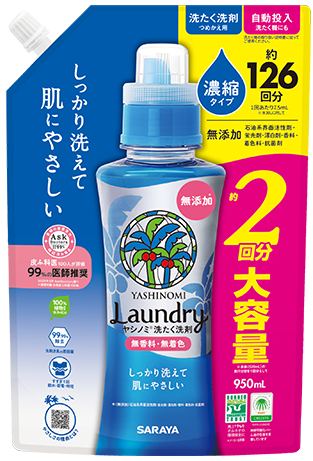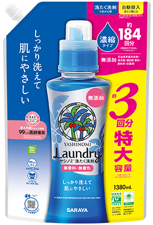 ヤシノミシリーズの肌と地球へのやさしさ、無香料・無添加のコンセプトはそのままに、高い洗浄力で皮脂汚れも食品汚れもしっかり洗浄する洗たく洗剤。